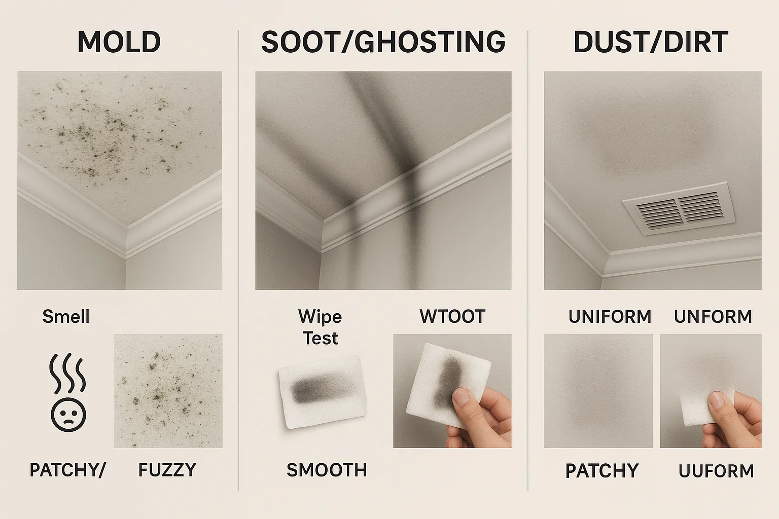- Wipe test: If a soft, dry cloth smears the spot gray/black like charcoal, think soot/ghosting. If spots remain embedded or feel slimy, think mold.