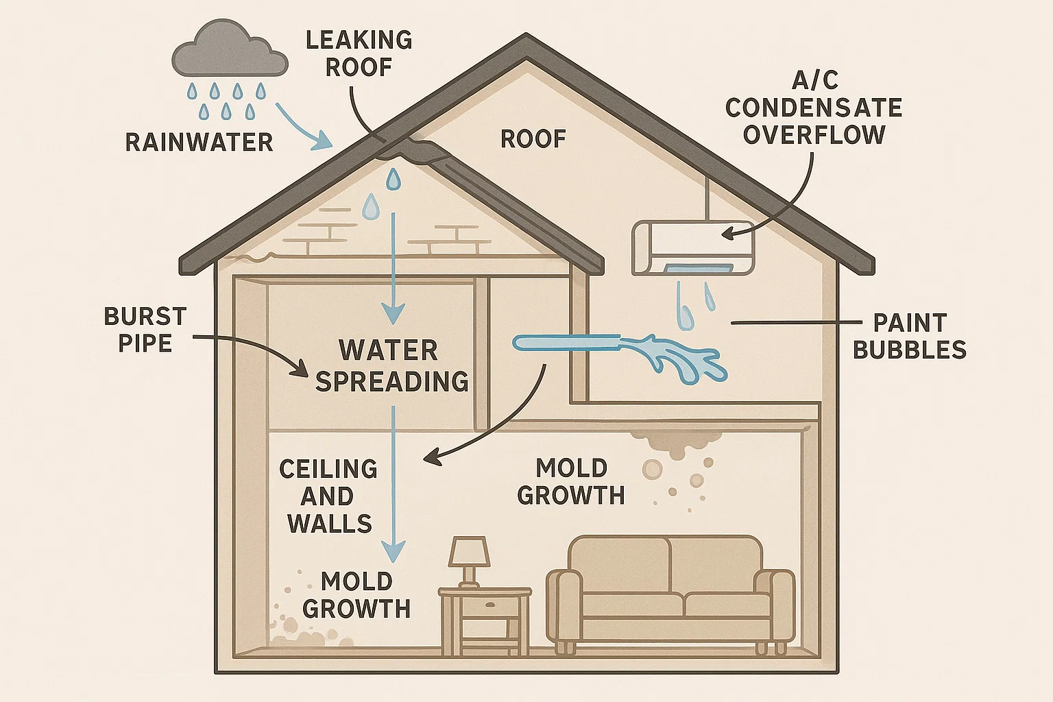 Water damage doesn’t happen overnight—it often starts slowly and builds up before you notice the signs. A small drip from a pipe inside the wall, a roof crack that lets in rain, or a blocked drain that causes water pooling can all lead to visible damage in your ceilings, walls, or flooring. When water penetrates into porous materials like plaster, wood, or insulation, it doesn’t just stay on the surface; it spreads internally. This hidden moisture weakens structures and creates an ideal environment for mold and bacteria. That is why water damage solution is not only about drying the surface—it must address the hidden moisture as well to truly stop the problem.