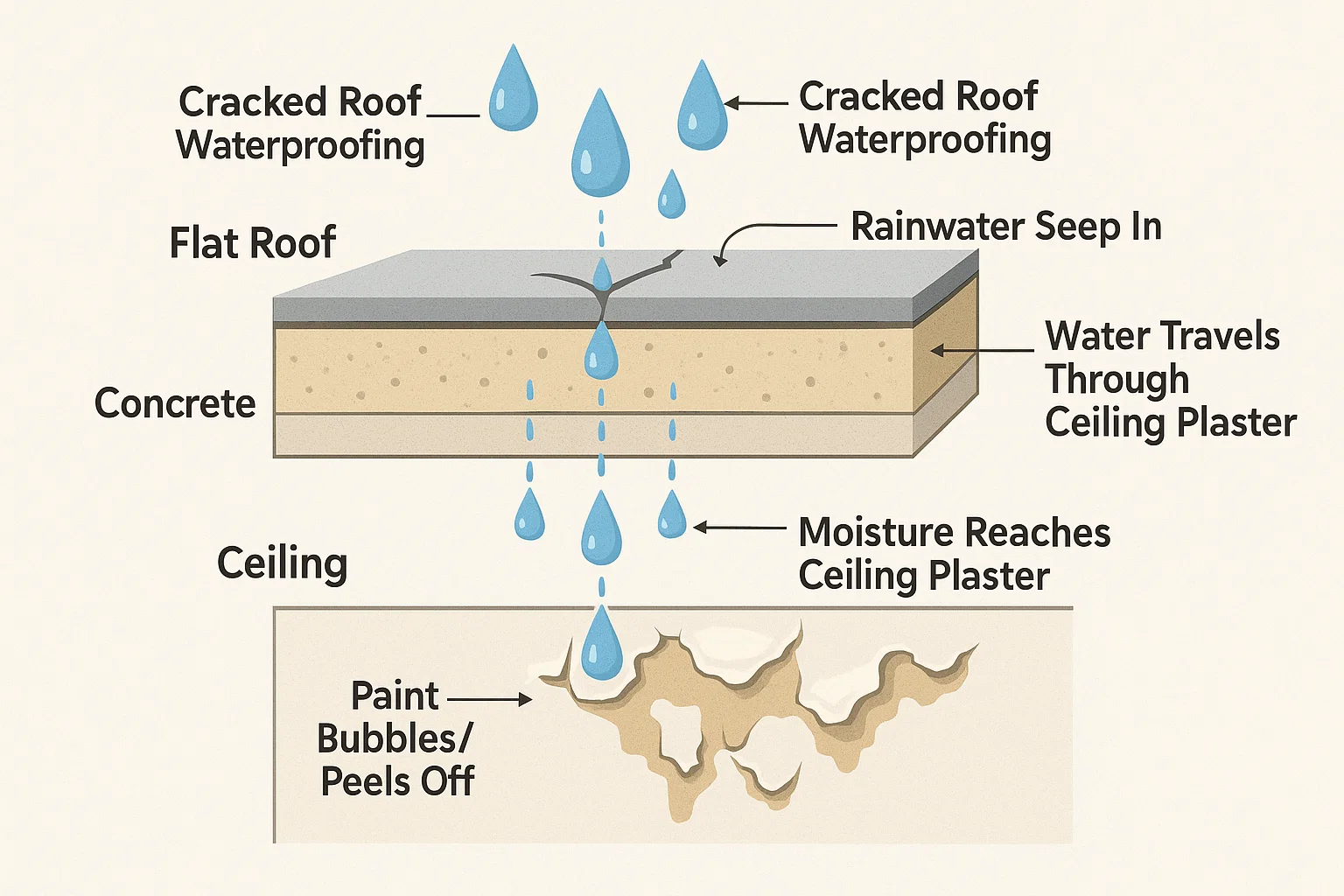 When rainwater or condensation passes through a crack in the roof, it begins to travel downward through concrete, insulation, or plaster layers. Water always seeks the easiest path, which means the wet patch you see on your ceiling is not always directly under the leak—it may have traveled along beams or pipes before surfacing. Once it reaches the painted surface, the moisture breaks the bond between the wall or ceiling and the paint layer. This causes the paint to blister, peel, or bubble. Over time, the damp area also becomes discolored, turning yellow or brown as minerals and dust are carried along with the water. If the problem continues, mold spores begin to grow, producing a musty smell and posing health risks to your family.
