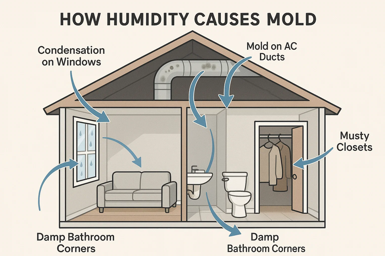Mold spores are everywhere around us, invisible to the eye and floating naturally in the air. On their own, they don’t cause problems until they land on a damp surface. When humidity levels rise above 60%, the air itself carries enough moisture to keep surfaces damp for longer periods of time. In a bathroom, kitchen, or even a living room cooled by air conditioning, condensation forms on walls, ceilings, and windows. This layer of moisture acts as a food supply for mold spores, which then begin to colonize. Over time, they spread across surfaces like wallpaper, grout, wood, or fabric. High humidity also slows down the drying of everyday spills or leaks, giving mold even more opportunity to grow unchecked.