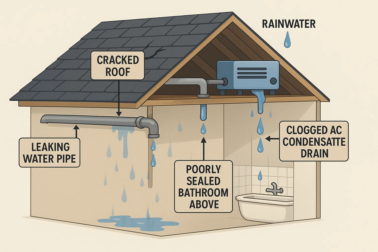There are many reasons a ceiling might start to leak, and most of them are linked to water intrusion from above. In apartments or villas, water often travels from one level to another, making it harder to trace. The most common culprit is plumbing. A small pipe leak above the ceiling can drip slowly for weeks before you notice the stain or dampness. Another cause is roof damage, especially during seasonal rains in the UAE when flat roofs collect water and tiny cracks let moisture seep inside. Air conditioning systems are also a major source of leaks. Condensate drain lines sometimes clog, causing water to overflow into the ceiling. Even poorly sealed bathrooms or kitchens above your living space can allow water to escape and travel downwards into the ceiling below.