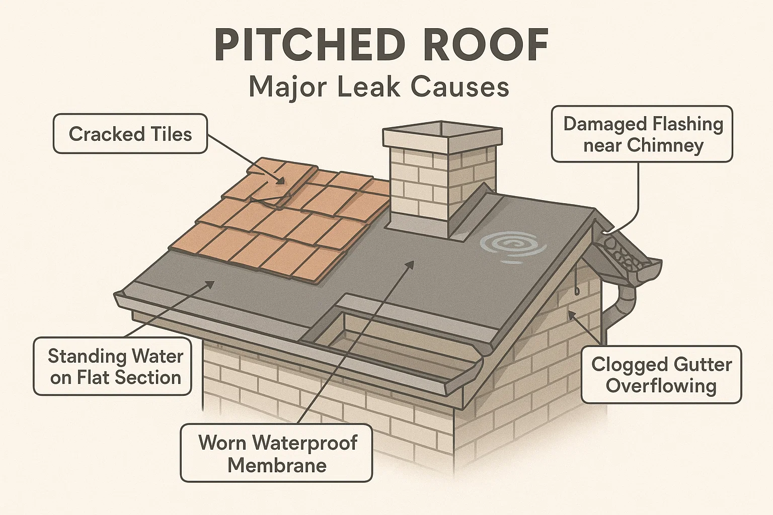 Roofs are designed to shed water quickly, but when gutters and drainage systems are blocked, water has nowhere to go. Leaves, dust, and debris can accumulate in gutters or roof valleys, creating mini dams that cause water to pool. Standing water is one of the worst enemies of any roof because it increases the weight load and gives moisture more time to find its way through cracks or seams. In flat-roof buildings, which are common in the UAE, poor drainage is one of the most common causes of leaks. Without a proper slope or functioning drains, water collects and eventually breaks through the weakest points.