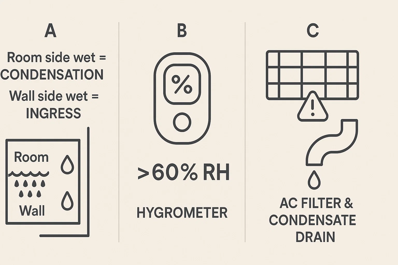AC filter & drain inspection: Dirty filters or blocked condensate drains push humidity back into rooms. Clean or replace filters monthly and ensure the drain is flowing.