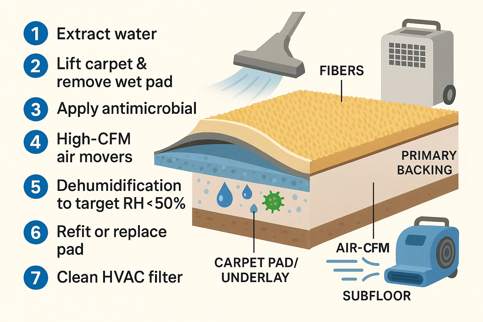 What we do: inspect the source, measure moisture, perform subsurface extraction, treat with the right chemistry (enzymes/antimicrobials), and accelerate drying with professional air movement and dehumidification. If necessary, we’ll lift sections, replace the underlay, and re-stretch the carpet to manufacturer tension so it looks and smells like new.